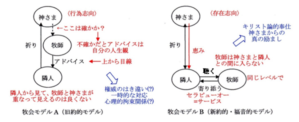 右側の牧会モデルBがLフォーメーションです。L字のような位置関係になります。ちなみに、左側はカミと人の間に自分を位置づけます。縦に並ぶので、Iフォーメーションと言います。キリスト教牧会・心理臨床では機能しません。