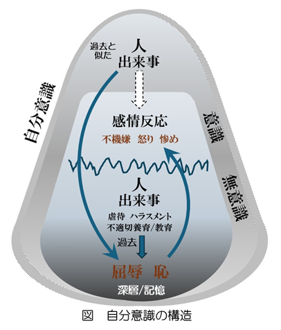 ここで不思議なことが起きます。ある人に初めて出会ったとします。一度も会ったことがないのに、嫌な気持ちが喚起されることもあれば、嬉しい気持ちが喚起されることもあります。過去に出会った人と似た人に会うと、人間は似た感情を追体験します(「図 自分意識の構造」参照)。
